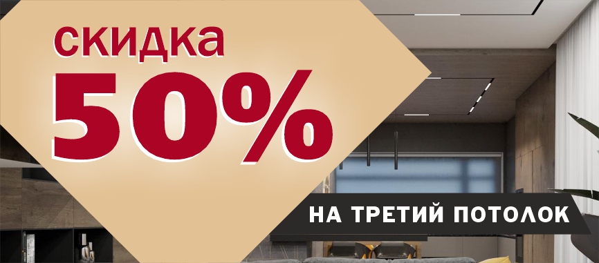 Получите скидку 50% на один из потолков при заказе и единовременной оплате установки трех и более потолков по одному адресу.